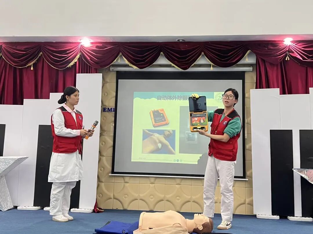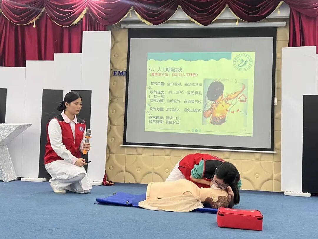 培训现场,宣讲团成员围绕心肺复苏、AED 使用、海姆立克急救法等关键急救技能进行细致讲解和规范演示。结合幼儿园安全防护实际需求,用通俗易懂的方式讲解操作要点,帮助教职工熟练掌握应急救护技能,进一步提升校园应急处置能力,为幼儿健康成长筑牢安全屏障。