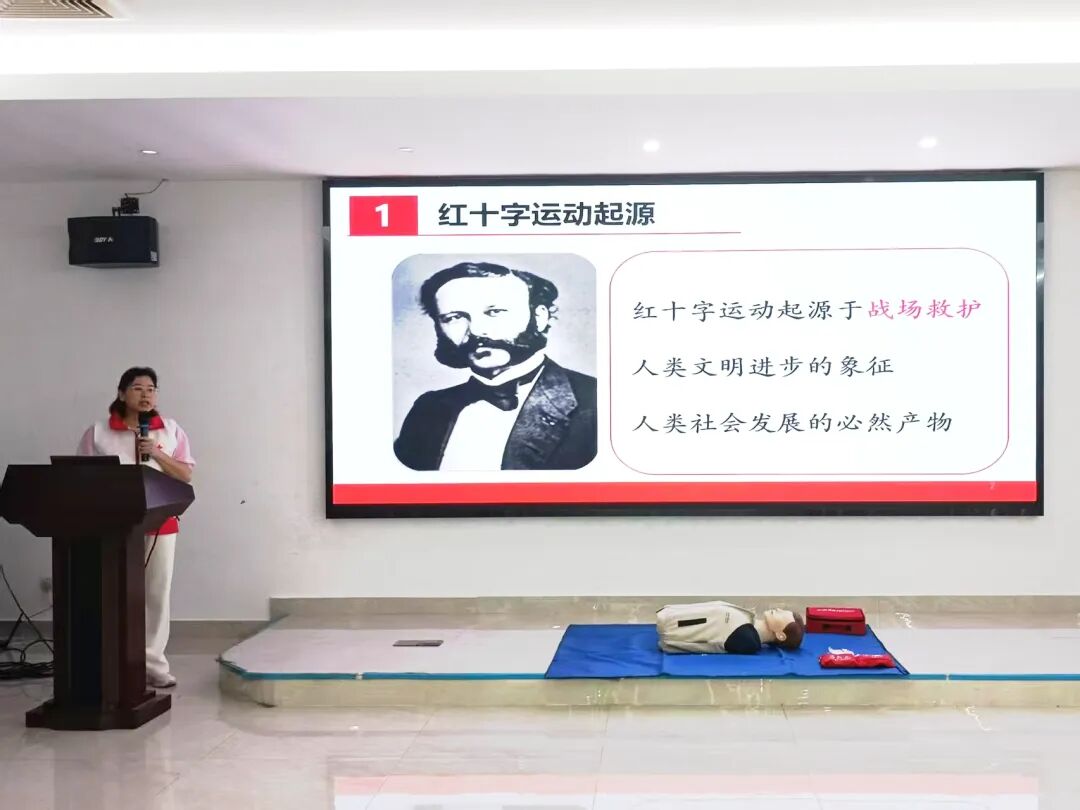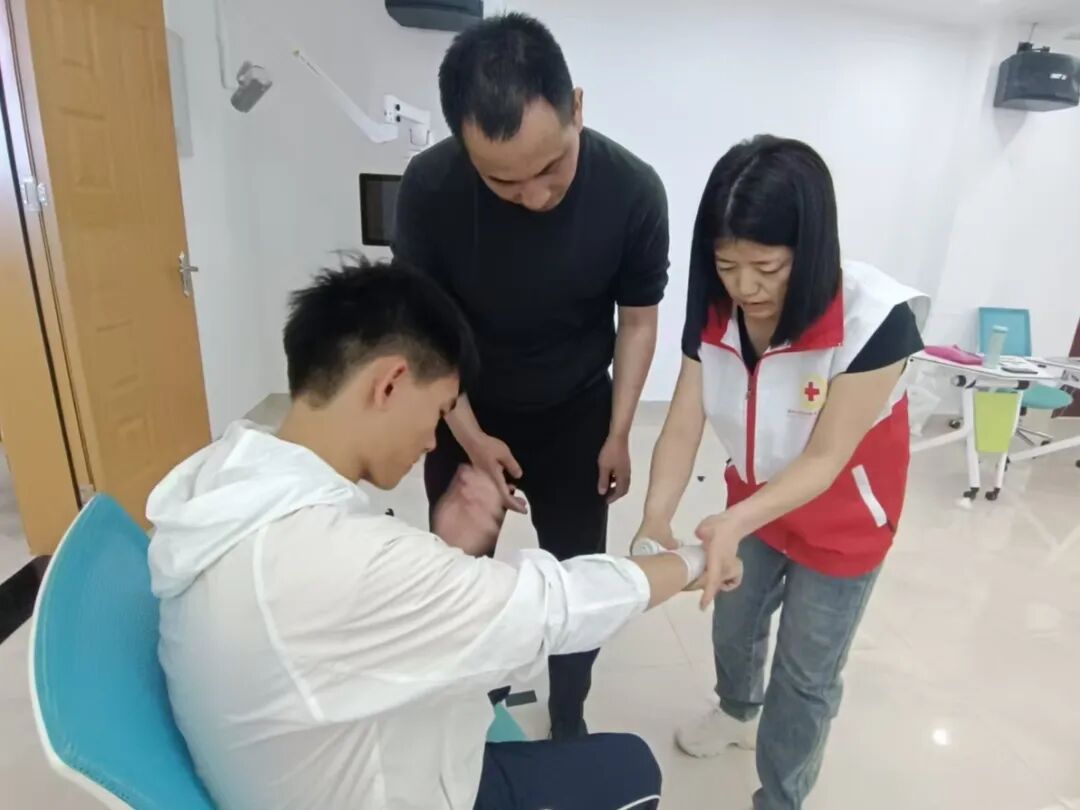 培训以党建为抓手,采用“理论讲解+示教演示”模式,何晓秋老师结合临床案例,系统讲解心肺复苏、AED使用、创伤包扎、海姆立克急救法等核心技能,助教团队现场精准演示、辅助教学,将党建责任担当融入急救技能教学,筑牢学员理论基础。